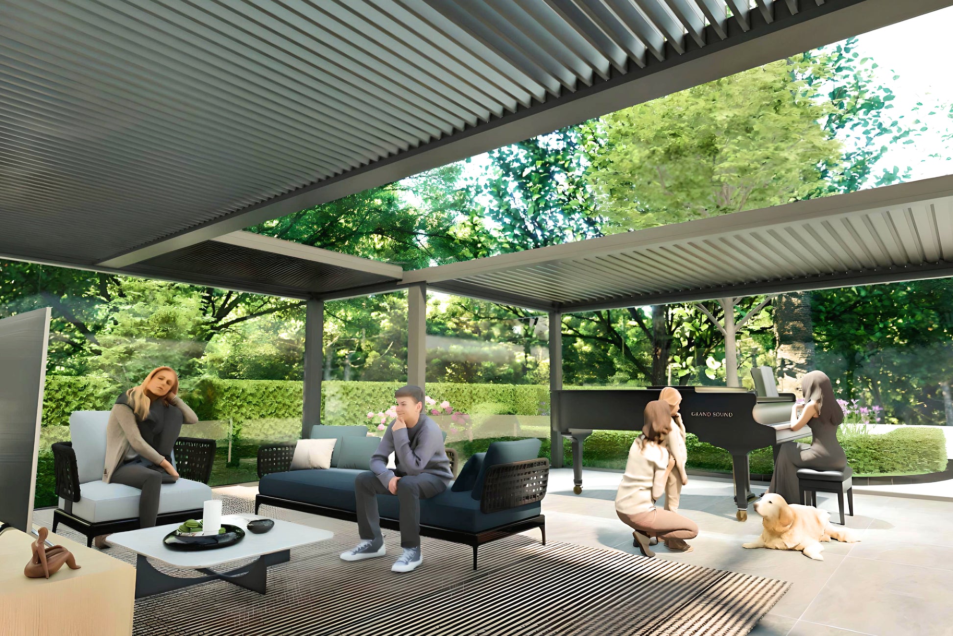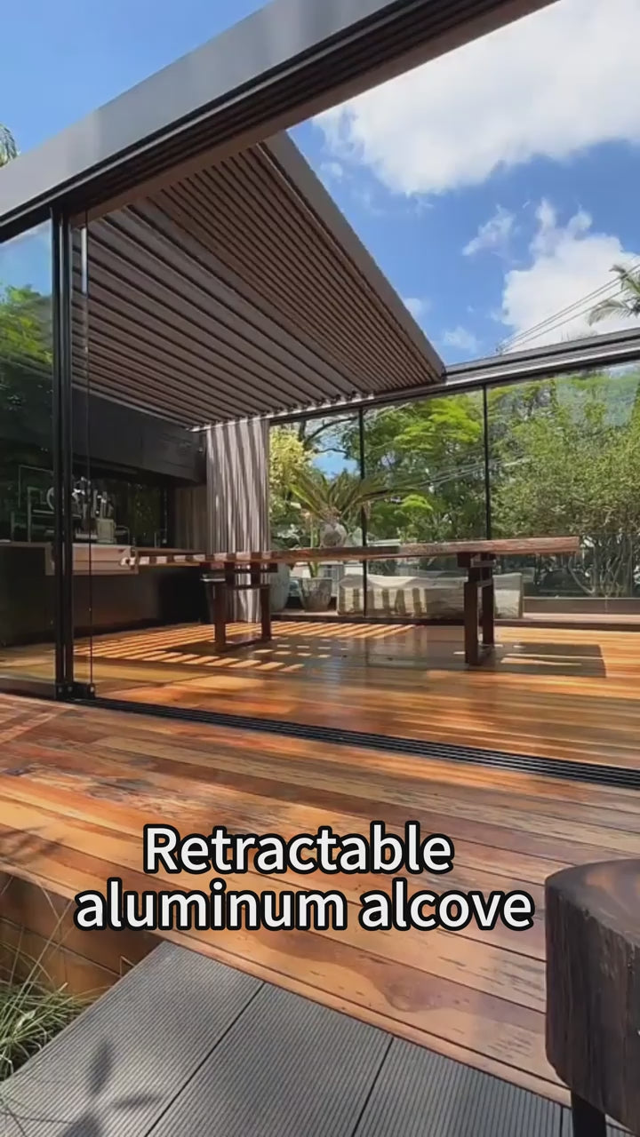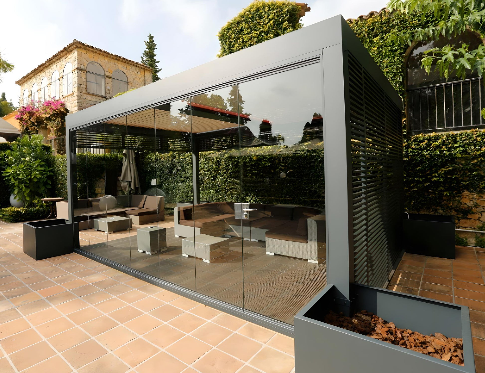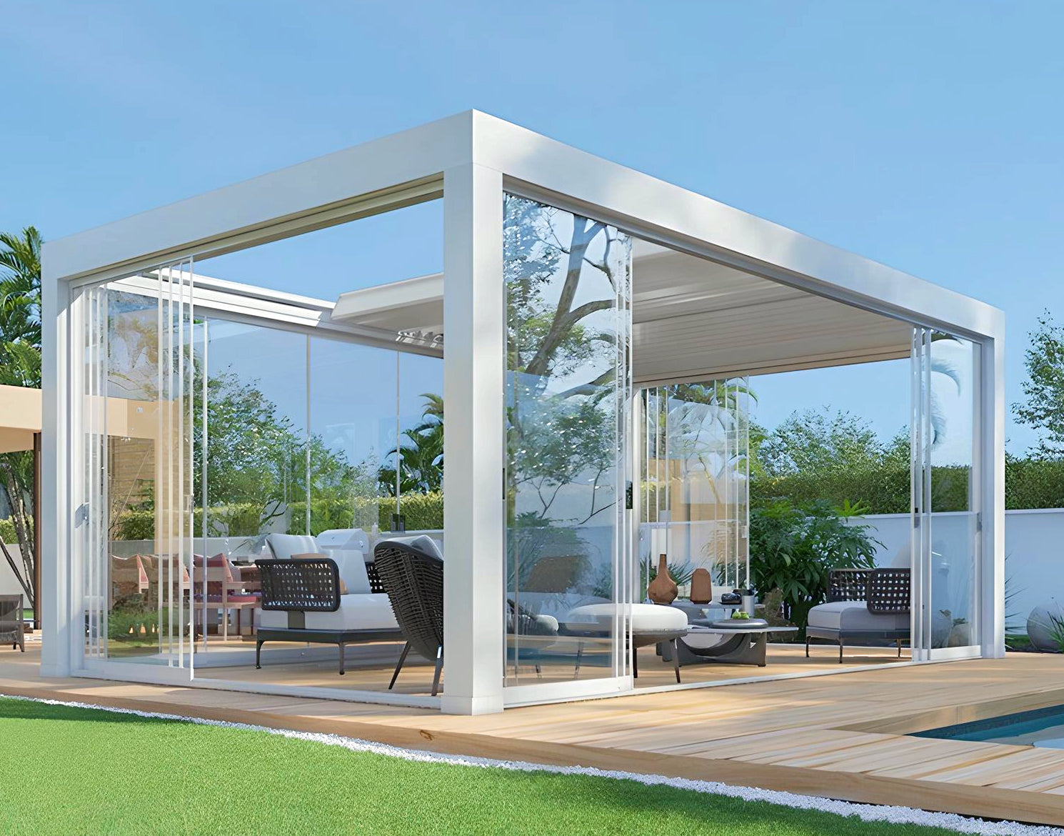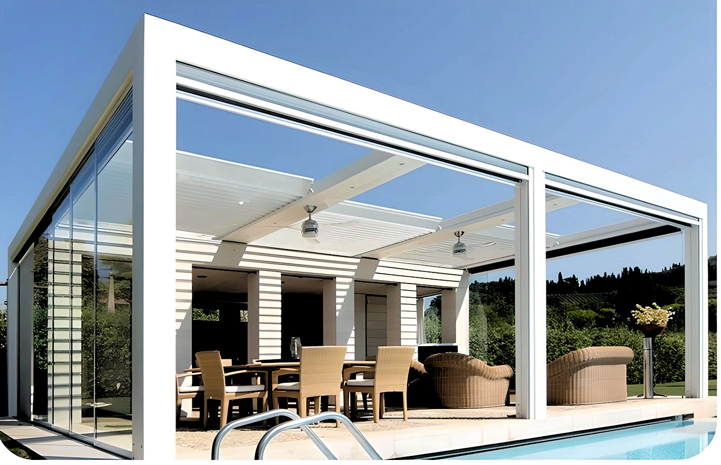 Our motorized retractable roof offers the ultimate in flexibility and comfort. With the push of a button, you can open up your space to the sky or close it for shelter, adapting effortlessly to changing weather. Enjoy the outdoors, rain or shine, with the perfect blend of style and convenience. (Product includes sliding glass walls.)