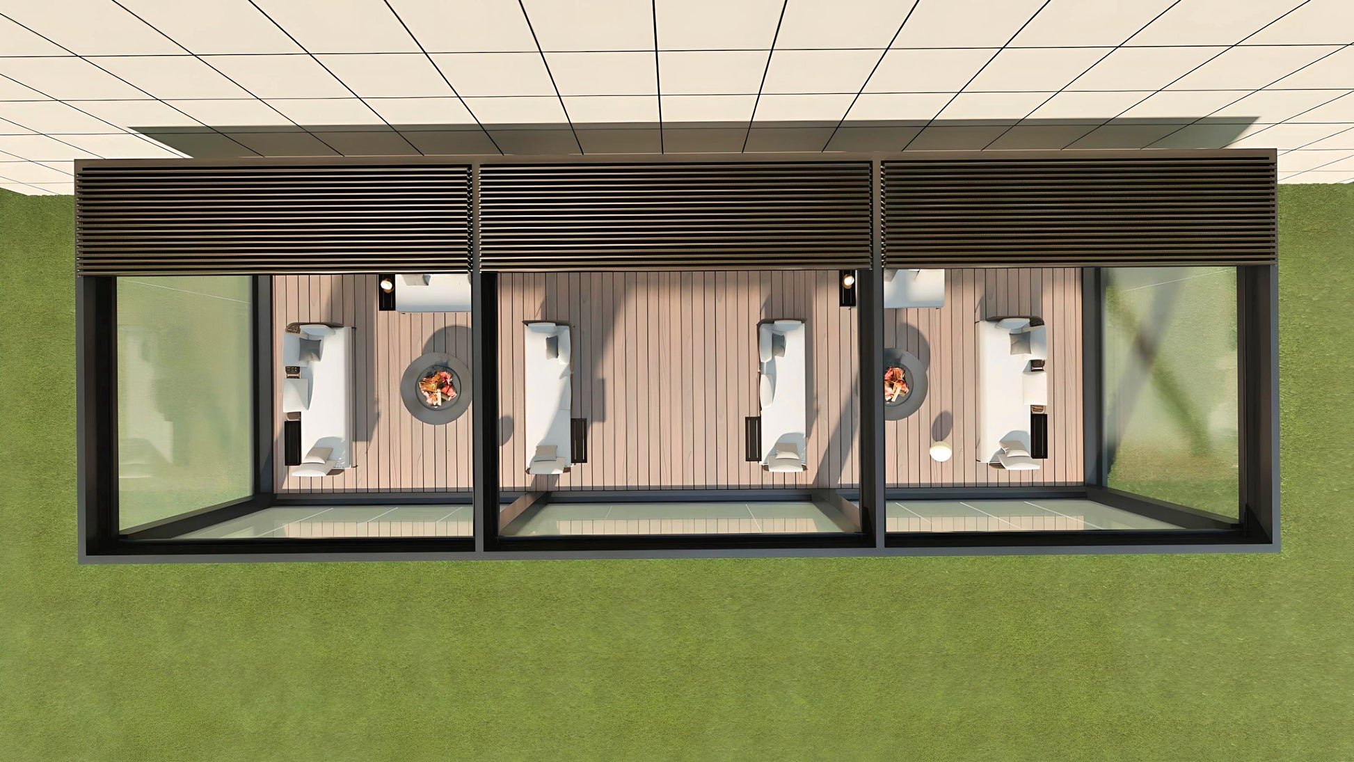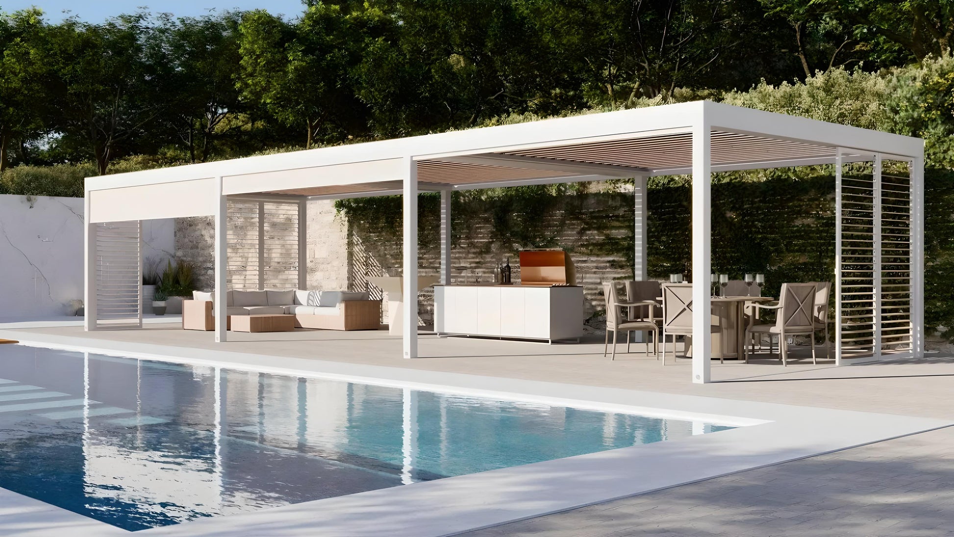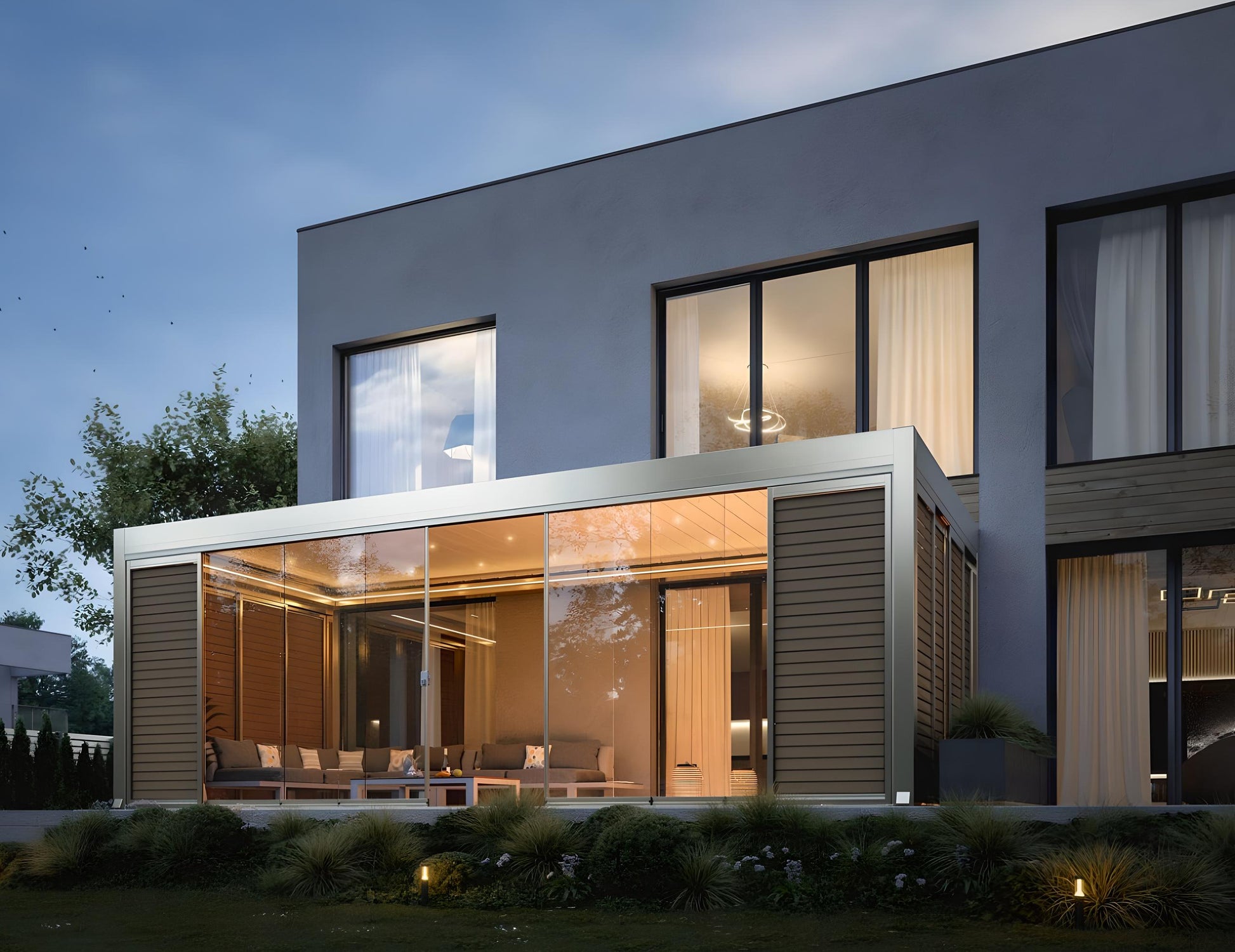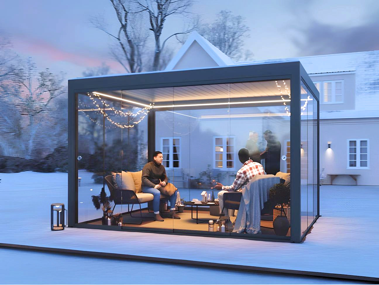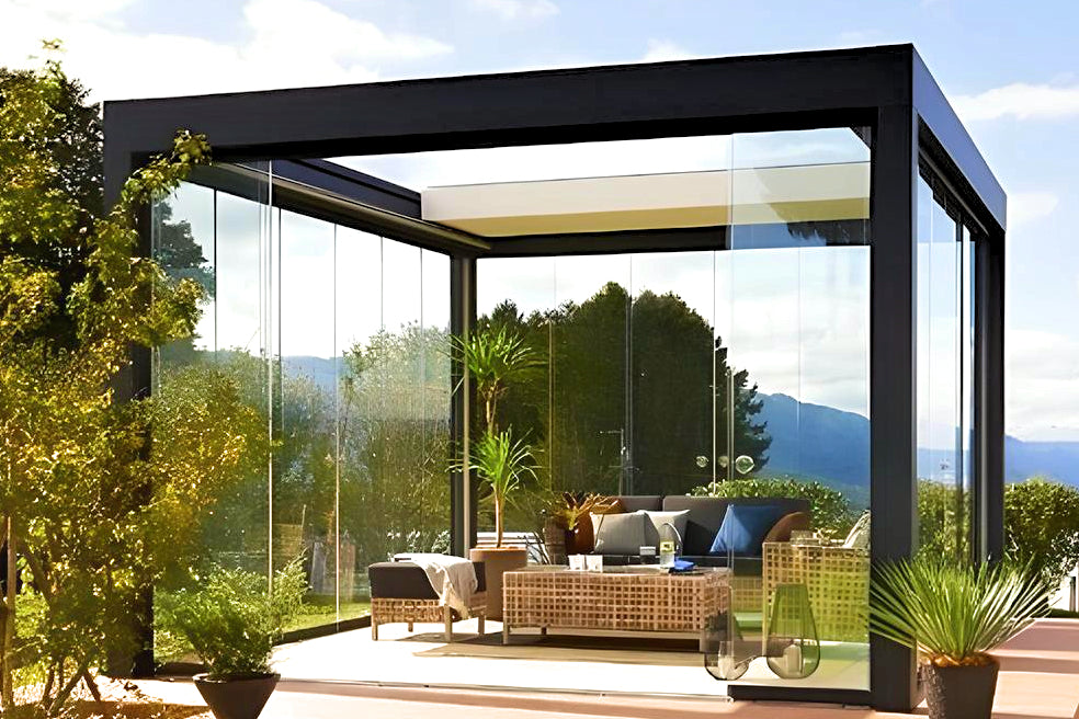 Our motorized retractable roof offers the ultimate in flexibility and comfort. With the push of a button, you can open up your space to the sky or close it for shelter, adapting effortlessly to changing weather. Enjoy the outdoors, rain or shine, with the perfect blend of style and convenience. (Product includes sliding glass walls.)